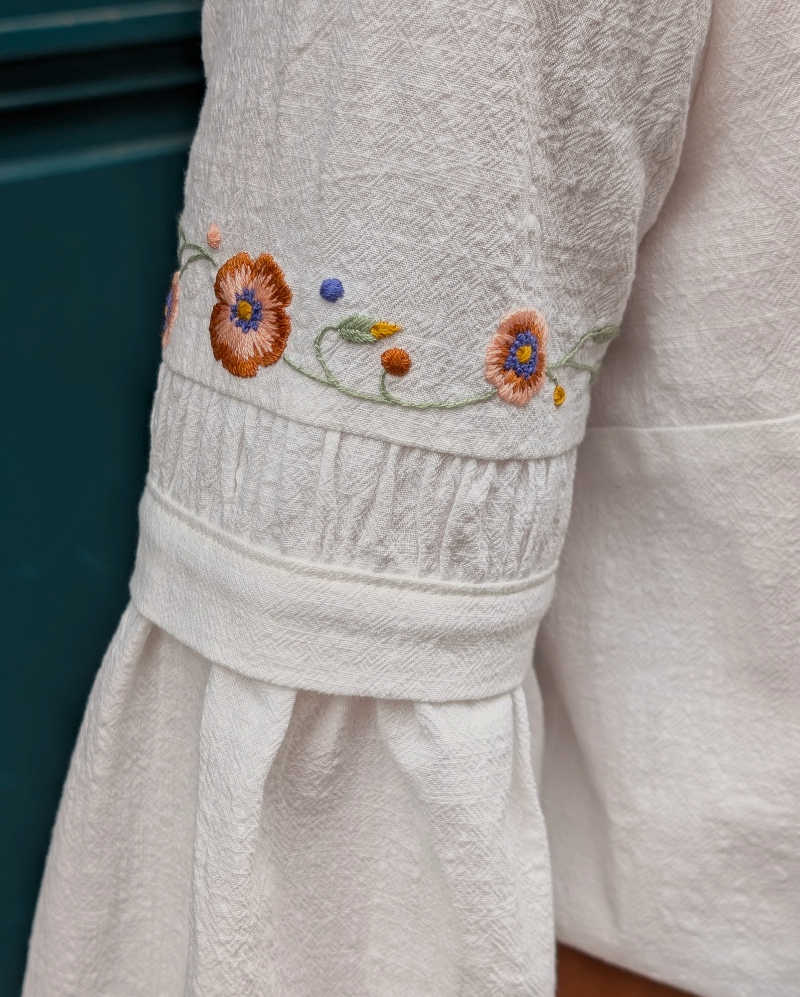 La blouse Myrtille est un modèle doux et romantique. Le corsage devant possède des pinces poitrine et un décolleté V très féminin. Au dos, un empiècement supérieur est associé à un pan froncé qui apporte un volume agréable. Un col montant peut être inséré dans l’encolure pour ajouter une touche d’élégance. Les détails les plus créatifs se trouvent au niveau des manches. Leur partie haute classique s’associe à une série d’empiècements créatifs : une première bande froncée, puis une deuxième bande à plier ou non, suivie d’un bas de manche froncé sur sa partie supérieure. Un élastique glissé dans l’ourlet vient resserrer la manche au niveau du poignet. Une option « manches cloches » est possible. N’hésitez pas à mixer les matières et les motifs sur les manches de Myrtille !